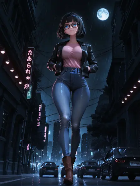 Outfit Prompt : glasses, black-framed eyewear, jacket, shirt, pink shirt, black jacket, pants, denim, leather jacket, jeans, long sleeves, boots, brown footwear