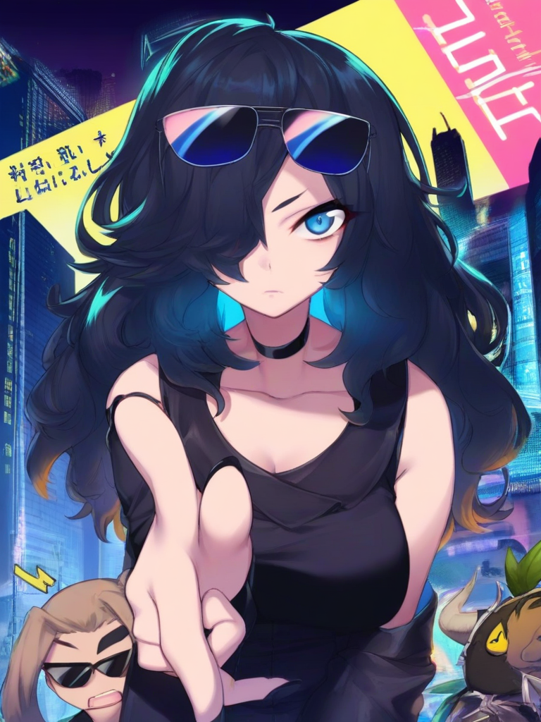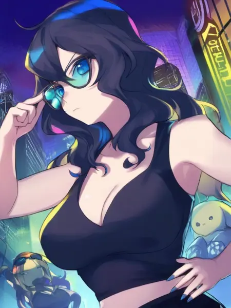 この画像は、前景にアニメーションされた女性キャラクターを描いた、活気に満ちてダイナミックなシーンを表しています。キャラクターはエッジの効いたやや反逆的な美意識を持ち、表情豊かな顔、濃い青い目、真剣な表情が特徴です。彼女は黒のノースリーブトップを着用し、その体型を強調しています。波打つ濃い色の髪は、頭の後ろ側に流れています。