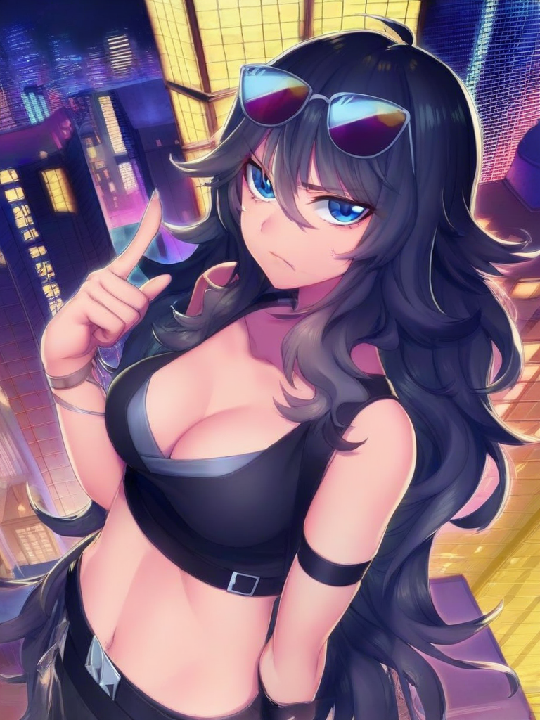 彼女の最も目を引く特徴は、眼鏡のスタイルです。彼女は目を完全に覆うサングラスを着用しており、神秘的で無頓着な雰囲気を醸し出しています。右手には銃を持ち、それは都市の街並みに向かって向けられており、行動や危険、対峙の状況を示唆しています。