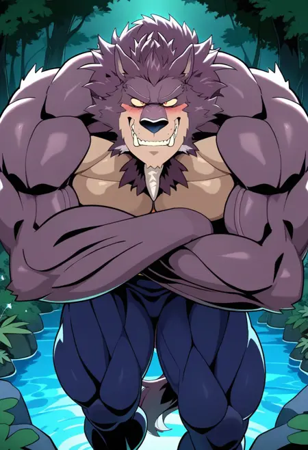 Reinforcement Prompts: "furry, wolf boy, tail, yellow sclera, red eyes, slit pupils, purple fur, purple back, purple ass, muscular, mature male, bara, alternate pectoral size, alternate muscle size"