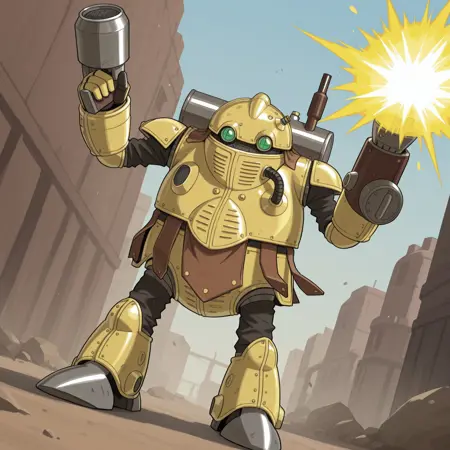 标签: 2D,男性,机器人,类人机器人,机械,机甲,黄色身体,绿色眼睛,装甲,单臂炮