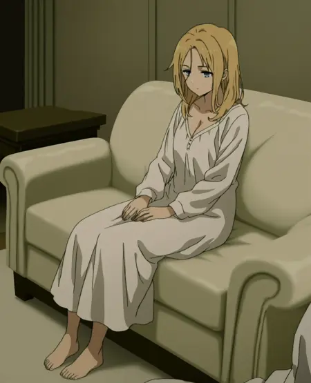 zenith greyrat, blonde hair, blue eyes, parted bangs,hair between eyes,medium hair