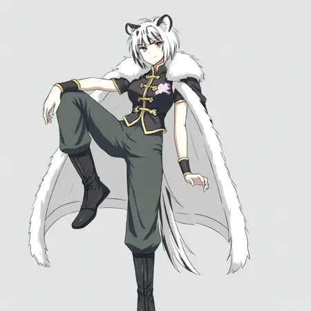 Mian, 1girl, solo, fur cape, peking opera hat, chinese boots, long hair, holding fan, smile, Peking Opera clothes