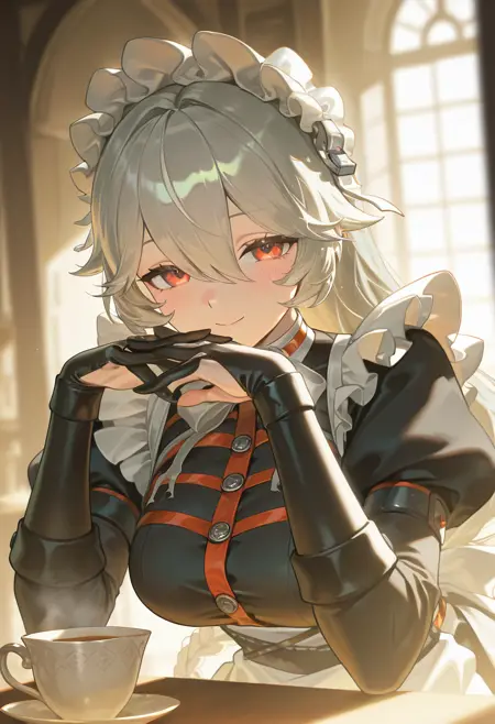 Tags for her outfit: gloves, long sleeves, dress, bow, frills, puffy sleeves, apron, black dress, maid, maid headdress, white bow, juliet sleeves, white pantyhose,