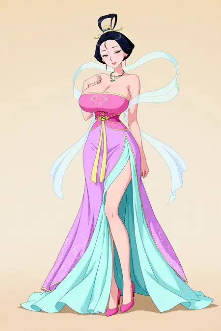 chang e, black hair, hair ornament, hagoromo, shawl, jewelry, earrings, necklace, lipstick, strapless dress, chinese clothes