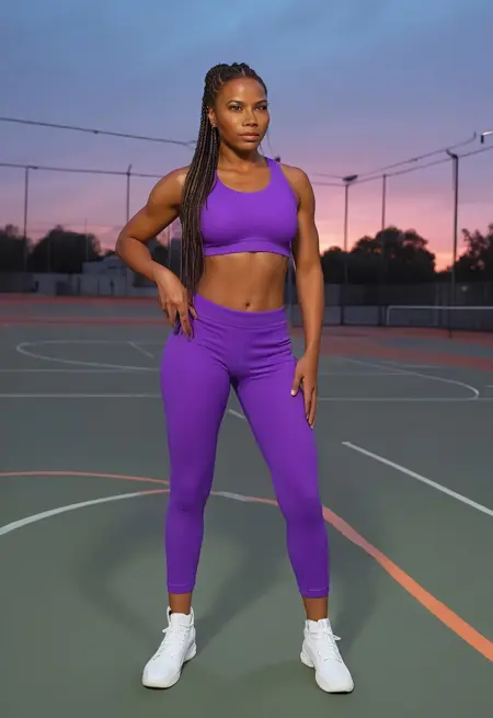 Style: Athletic elegance — form-fitting midi dresses, structured blazers, and sleek sneakers by day; silk wraps, minimalist gold accents, and subtle sensuality by night