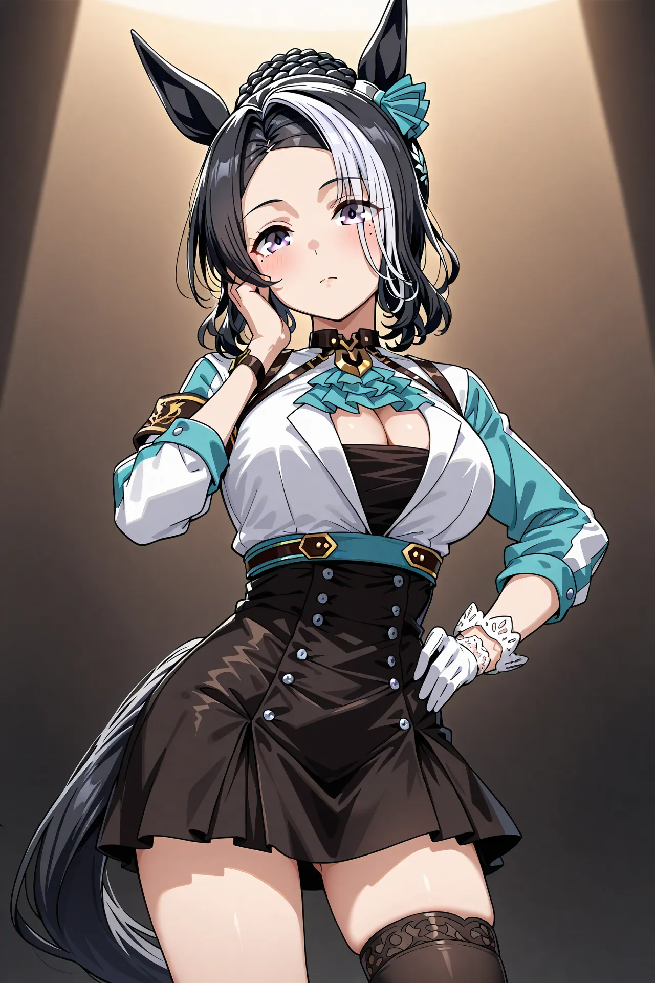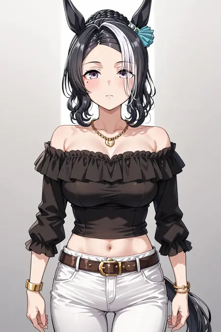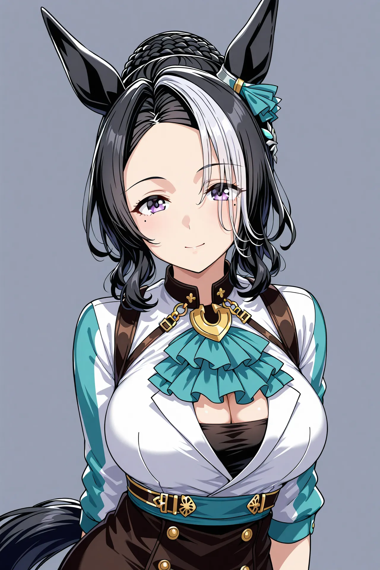 馬の尾、馬の耳、馬の娘、黒髪、白髪、複色の髪、黄色い目、青い目、紫の目、黒い目、ピンクの目、目の下のほくろ、分け目のある前、黒髪、白髪、複色の髪、黄色い目、青い目、紫の目、黒い目、ピンクの目、目の下のほくろ、分け目のある前髪、片側の髪の結び目、額、編み込み、編み込みの結び目、前髪、二色の髪、髪の結び目、中くらいの長さの髪、ストライプ入りの髪、