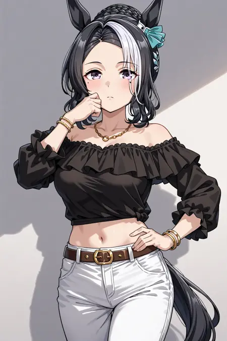 肩を露出、ベルト、ブレスレット、鎖骨、ジュエリー、長袖、腹部、へそ、ネックレス、黒いオフショルダーシャツ、オフショルダー、白いズボン、黒いシャツ、