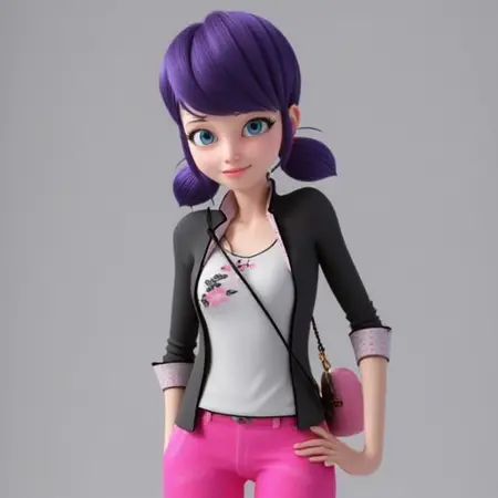 要获得动画中的服装:“CGI Marinette,紫色头发,穿着粉色长裤、黑色夹克、白色衬衫和粉色包包”。