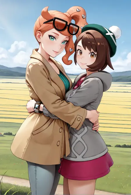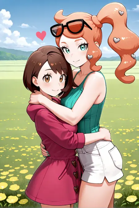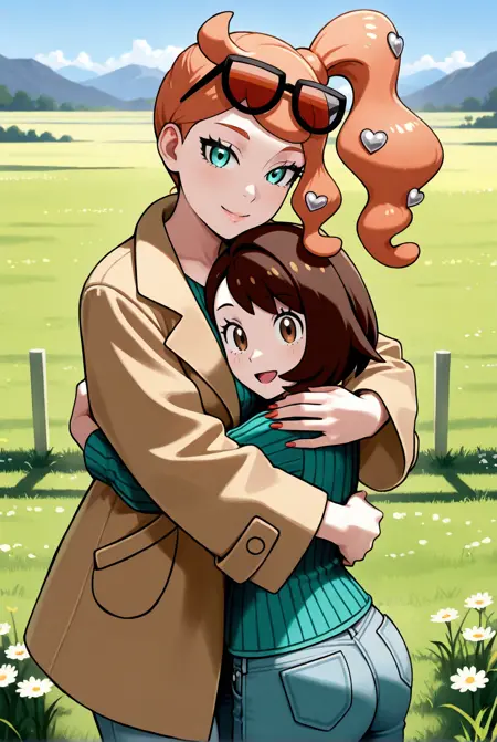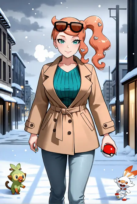 Sonia, orange hair, side ponytail, aqua eyes, heart hair ornament, denim, eyewear on head, black-framed eyewear, blue pants, brown coat, ribbed shirt, aqua shirt, high heel boots, green boots