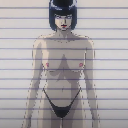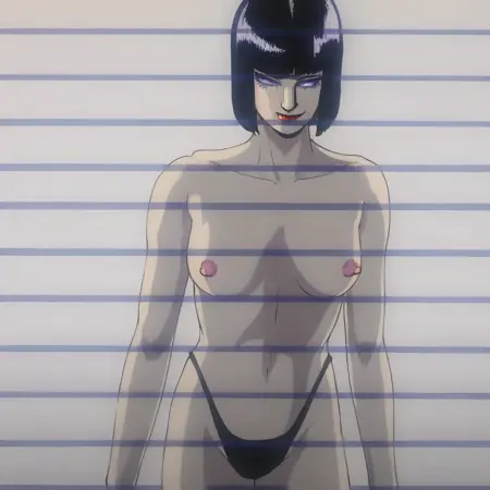 PeacockMGE, 1girl, solo, beautiful woman, short hair, black hair, bob cut, blunt bangs, eyelashes, purple eyes, nose, red lips, makeup, collarbone, large breast, nipples, navel, midriff, groin, black underwear, thick thighs, high heels, peacock feathers, nail polish,