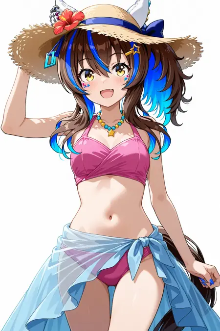 짚 모자, 비키니, 핑크 비키니, 샌들, 귀 커버, 파란 모자 리본, 파란 리본, 꽃, 히비스커스, 파란 손톱, 배꼽, 허리 캡,