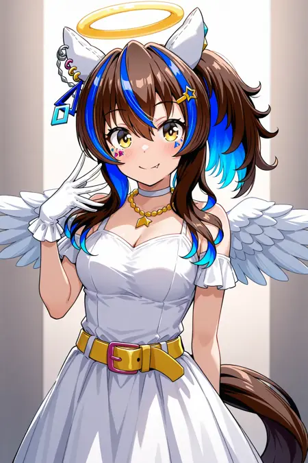 어깨 노출, 초크, 가슴 노출, 드레스, 장갑, 흰 드레스, 천사 날개, 할로, 체인, 귀 장식, 박쥐 패치, 노란 벨트, 벨트,