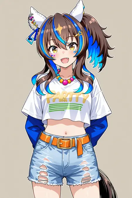 말 꼬리, 말 귀, 말 소녀, 갈색 머리, 검은 머리, 파란 머리, 다색 머리, 갈색 눈, 노란 눈, 이색 머리, 앞머리, 쓸어올린 앞머리, 옆머리 꼬리, 꼬리머리, 긴 머리, 줄무늬 머리, 색상 내부 머리, 눈 사이 머리, 중간 길이 머리,