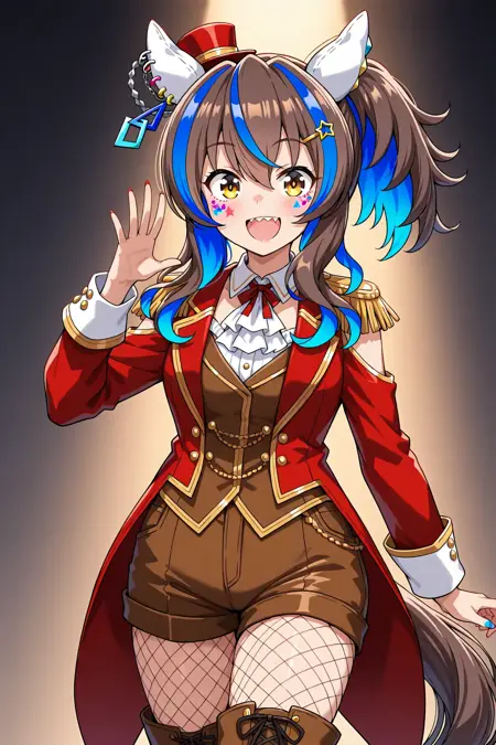 갈색 반바지, 그라데이션 줄무늬 머리, 피쉬넷 스타킹, 이색 손톱, 긴 소매, 미니 모자, 어깨 절개, 코트테일, 꼬리머리, 빨간 테일코트, joyful jamboree!, 하이힐 허벅지 부츠, 기울어진 모자, 어깨장식, 흰색 분리형 칼라, 갈색 조끼, 빨간 목 리본, 얼굴 페인트, 흰색 아스코트,