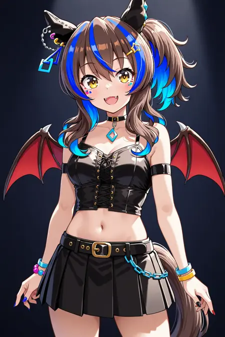 어깨 노출, 박쥐 날개, 벨트, 검은 손톱, 파란 손톱, 팔찌, 초크, 손톱, 눈 사이 머리, 보석, 복부, 네일 폴리시, 배꼽, 접힌 치마, 보라색 손톱, 빨간 손톱, 치마, 트윈테일, 날개, 검은 드레스, 체인, 귀 장식, 팔찌,
