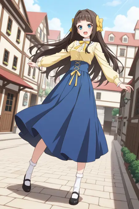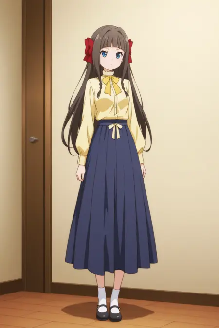 학교 유니폼, 노란 리ボン, 흰 셔츠, 긴 파란 치마, 메리 제인 신발