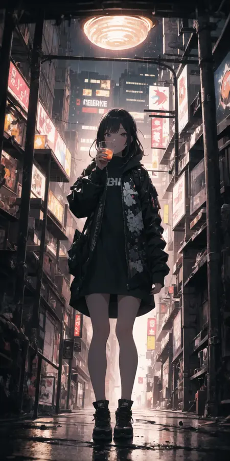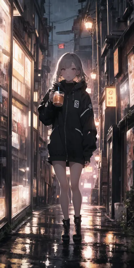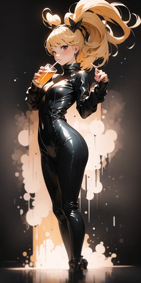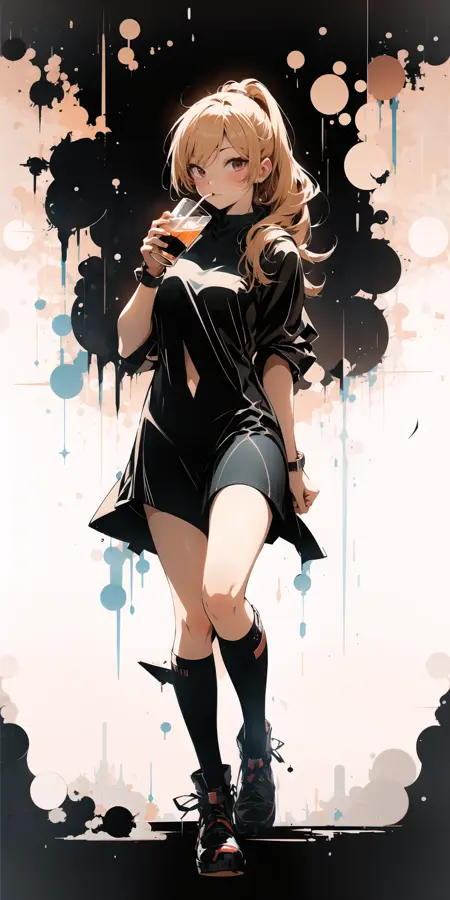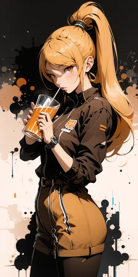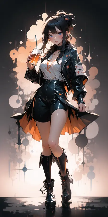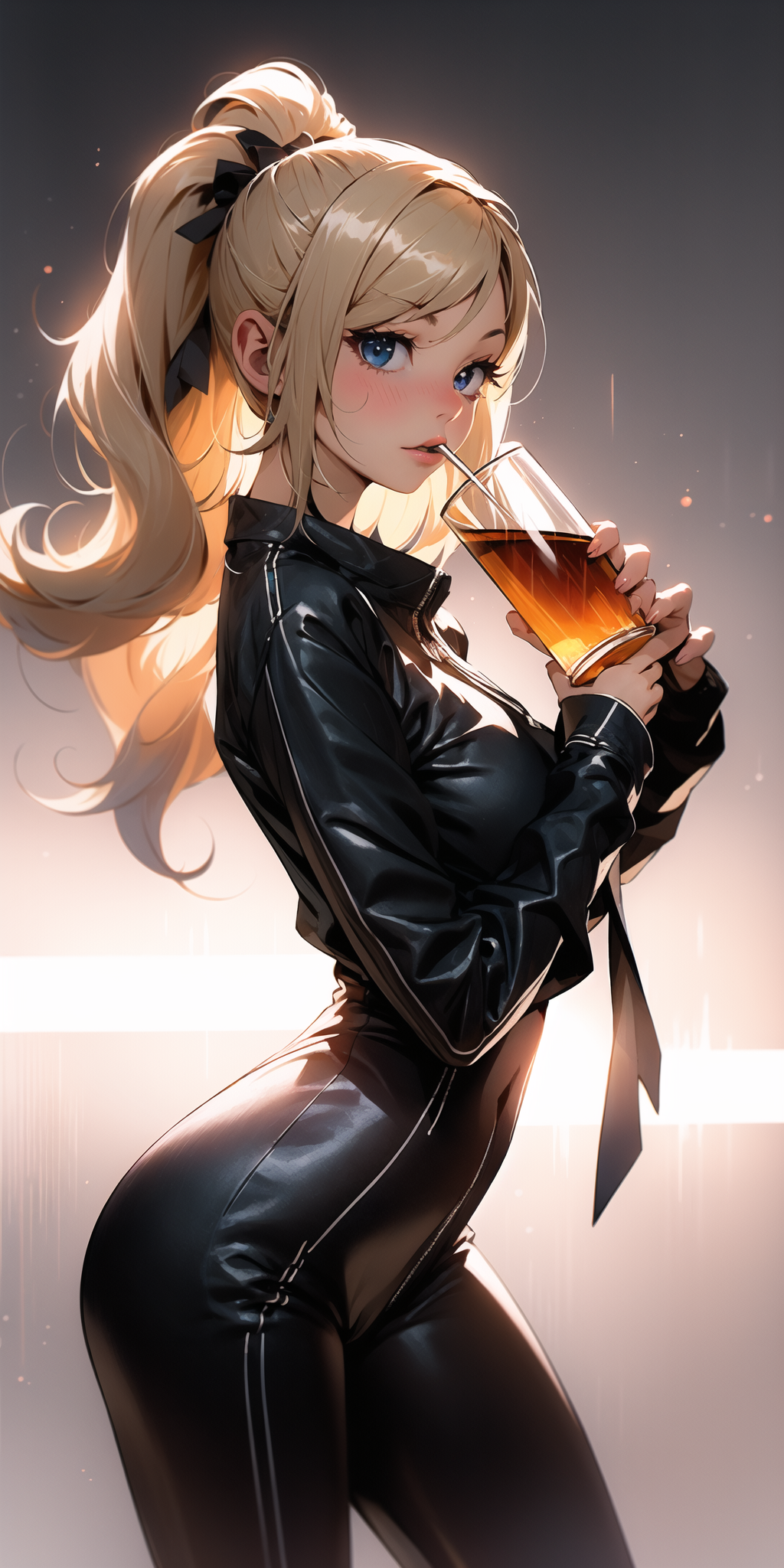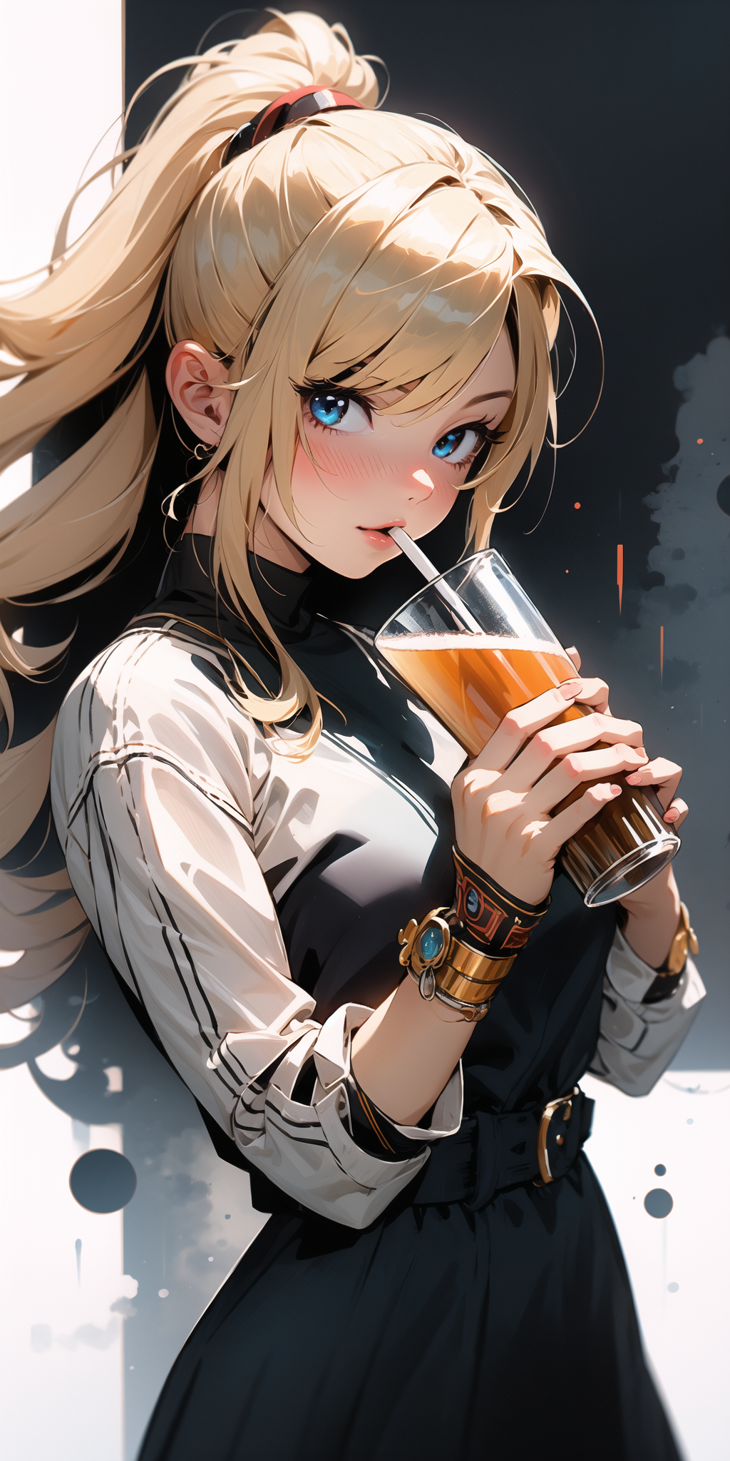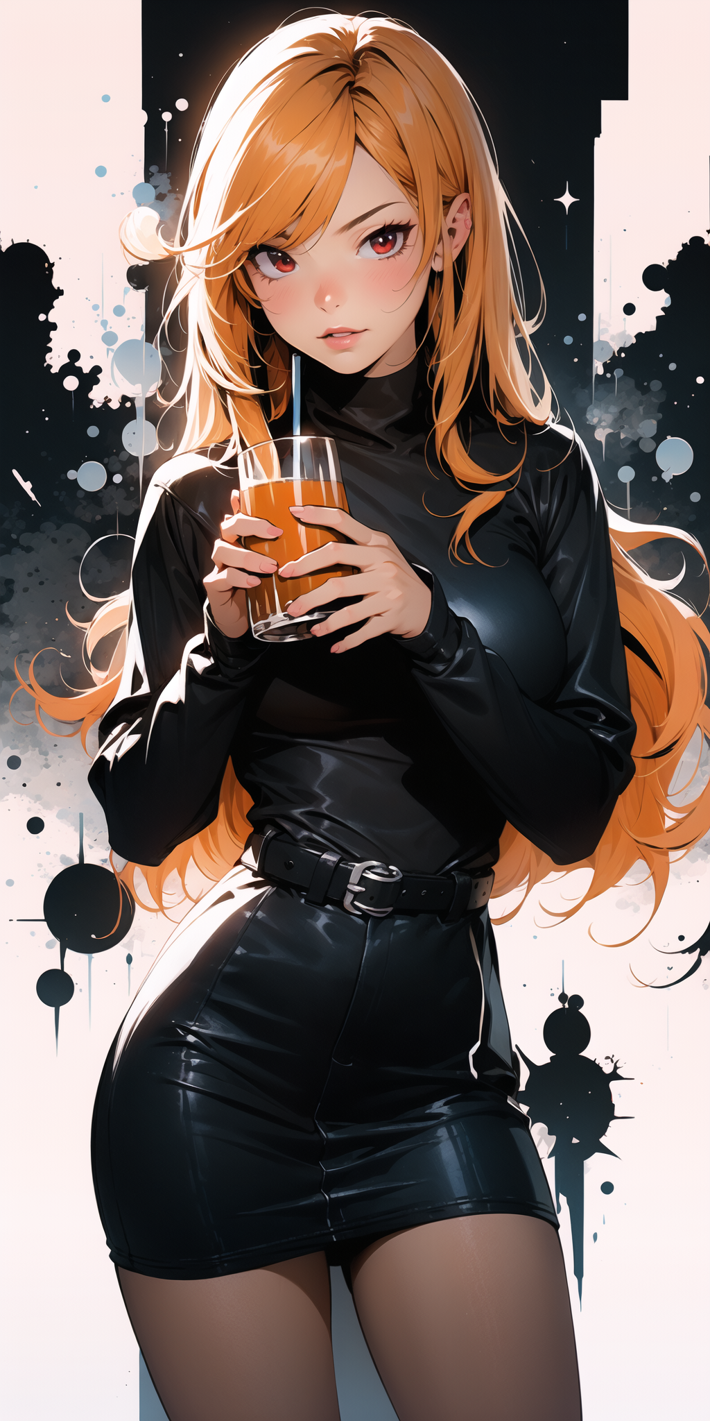 더 자세한 설명: 긴 머리, 보석, 손에 들고 있음, 셔츠, 넥타이, 팔찌, 그라데이션, 검은 치마, 흰 셔츠, 컵, 중간 크기의 가슴,