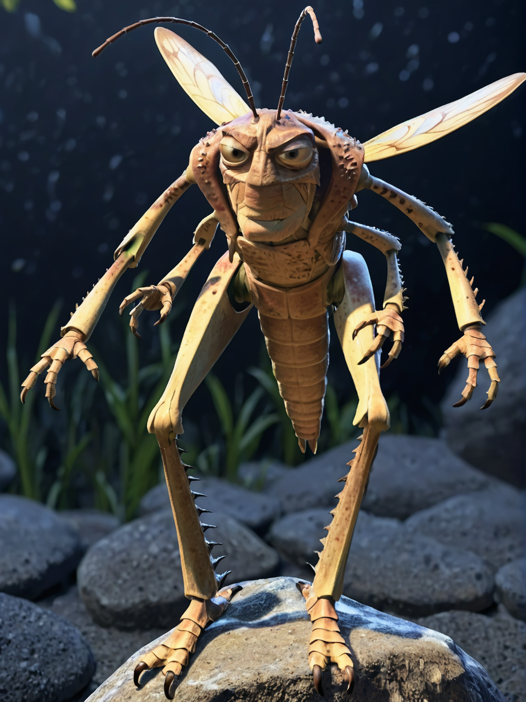 触角, 外骨骼, 分节身体, 四条手臂, 带刺手臂, 三个手指, 昆虫翅膀, 翅鞘, 节肢动物尾部, 带刺腿部, 带刺胸甲,