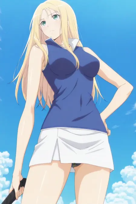 Chr_Reiko, Rei_Exe, green eyes, brown hair, blue shirt, sleeveless, white miniskirt