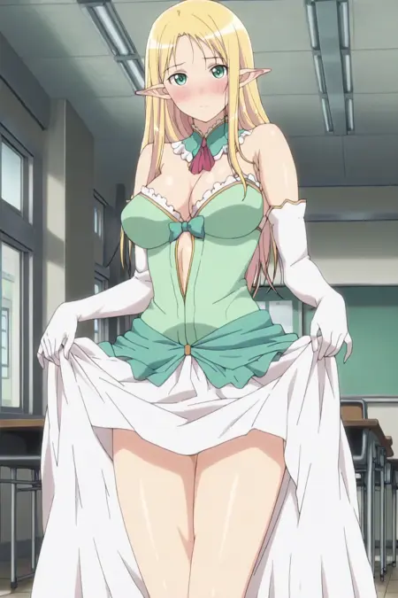 Chr_Reiko, Rei_Dre, green eyes, blonde hair, pointy ears, detached collar, green dress, white skirt, long skirt, elbow gloves