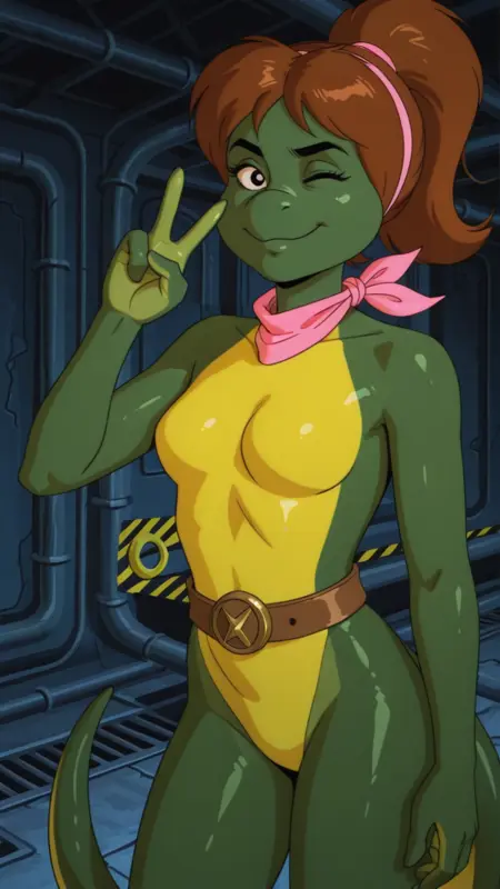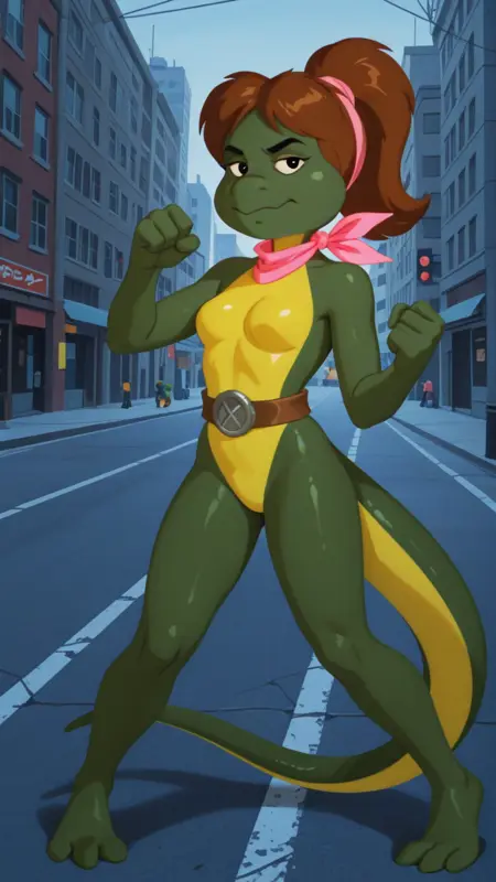 Appearance Tags: 1girl, monster girl, smooth skin, anthro, amphibian, reptilian, salamander, green skin, yellow chest, brown hair, ponytail hair, tail, pink hairband, hair pink scarf, black eyes, brown belt,