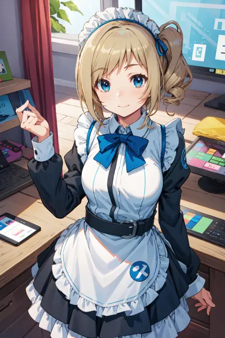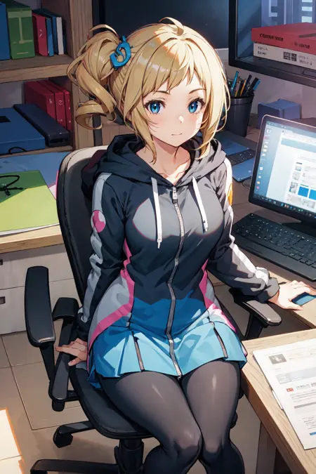 이노리의 기본 복장: 이노리 아이자와, 금발, 파란 눈, 측면 페이스 테일, 로고 헤어클립, 흰색 민소매 상의, 한쪽 팔 소매, 흰색 레깅스, 검은 신발, 검은 허리 밴드, 파란 치마