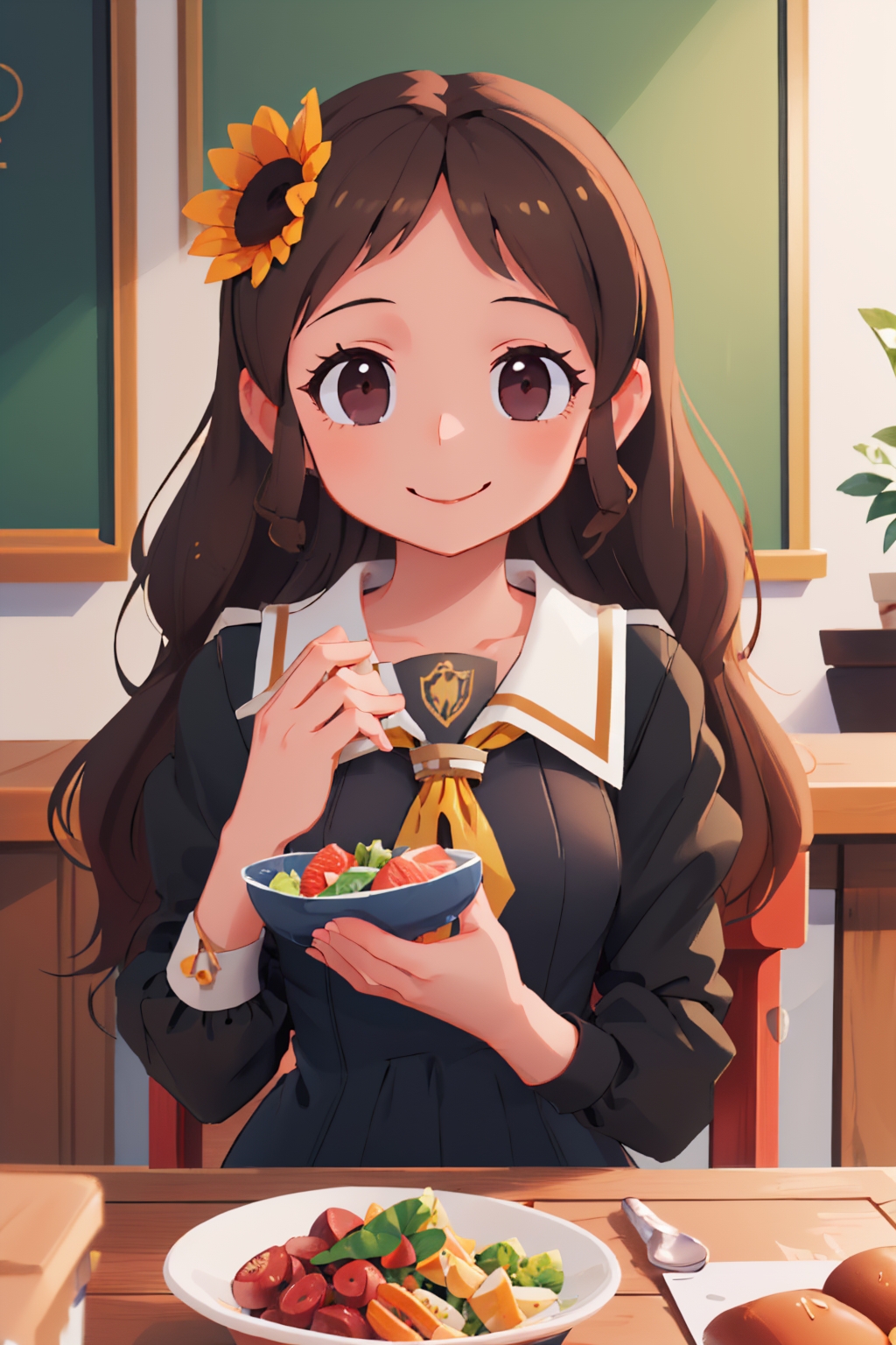 テミス法学院の制服: 髪の花, 学校制服, 黒いドレス, 黄色のネクチーフ, 長袖
