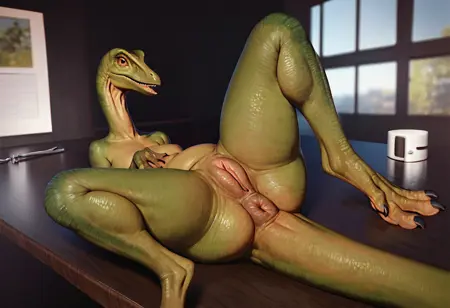 compsognathus, small dinosaur, 3 fingers, claws, dinosaur legs, orange eyes, green skin