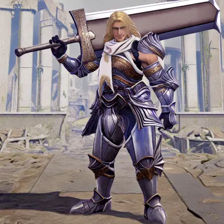 masterpiece, best quality, absurdres, 1boy, male focus, solo, Siegfried, SC6_Siegfried, long hair, blonde hair, scar over left eye, white scarf, white and gold armor,