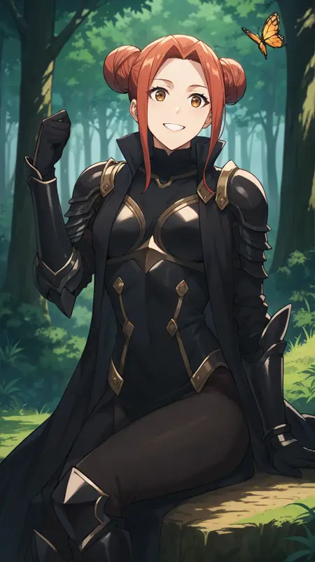 akari_shimizu_sl, 红发, 双发髻, 分开的头发, 发丝飘动, 棕色眼睛, 黑色外套, 黑色盔甲, 高领, 黑色手套, 黑色护臂,