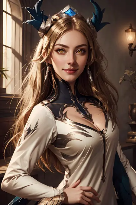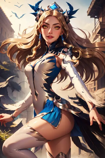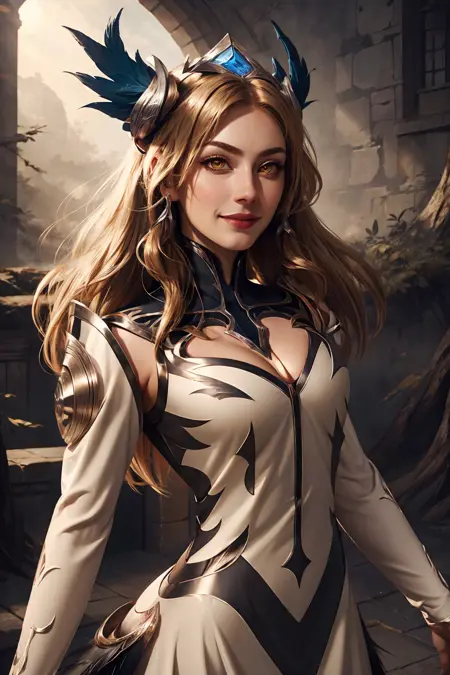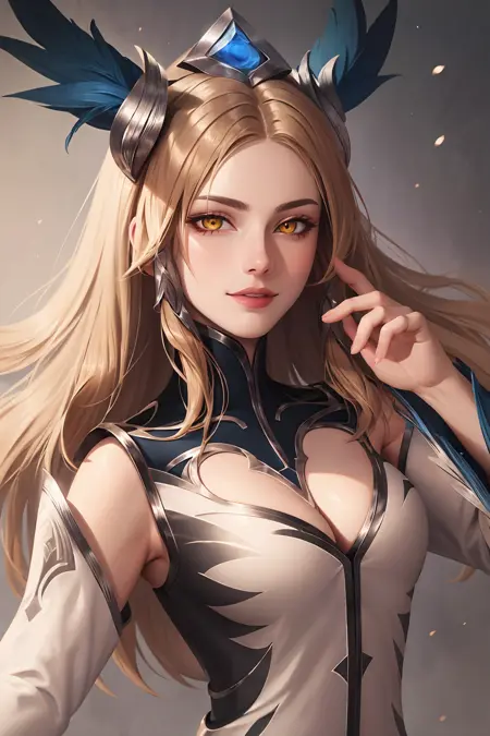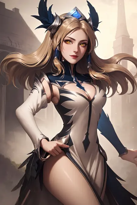 タグ: ig irelia, 1girl, 髪飾り, ブロンドヘア, 羽根, 外袖, ドレス, 胸元, 黄色い目