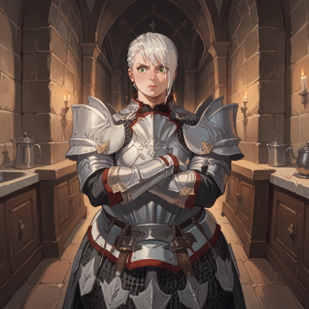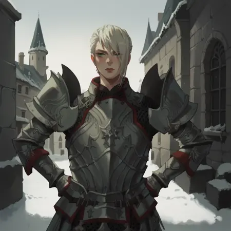 Trigger words: luciajunius, short hair, hair over one eye, green eyes, armor, pauldron (for her temple knight's outfit). Also i recommend to use white hair in prompt and hair bun in negative