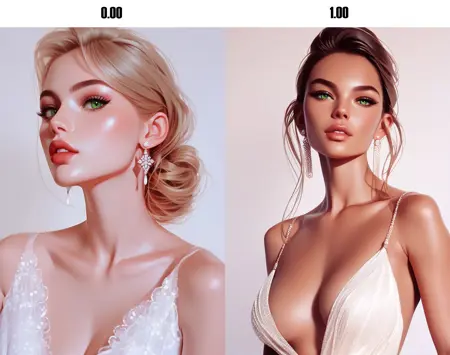 在约 -1.00 时会产生特殊绘画/卡通效果,此时提示中需包含“realistic eyes”(通常情况下无需添加“realistic eyes”)