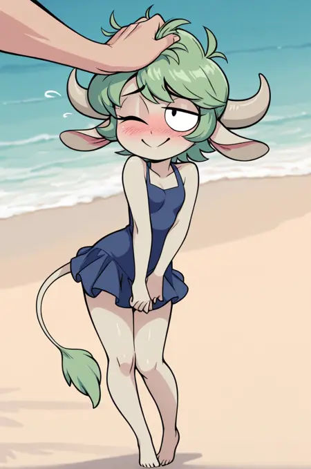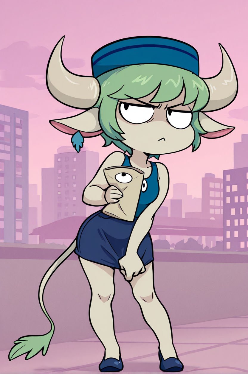 1girl, r@m, green hair, blue hat, cow tail, solo