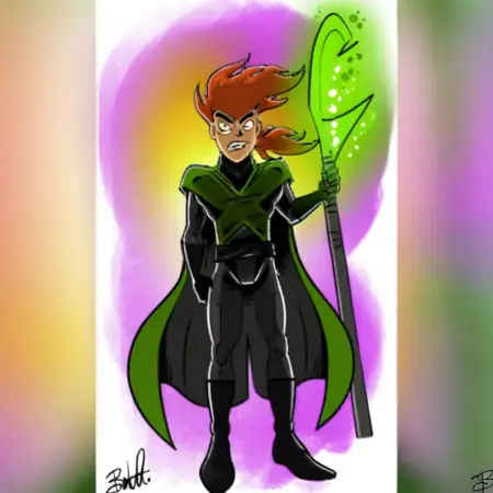 gray jumpsuit with black boots, collar, belt and gloves, and a green cape which is green on the outside and gray on the inside that covers his chest. He has longer hair with a ponytail.