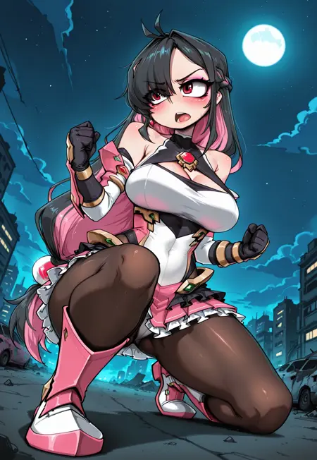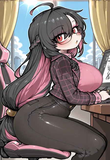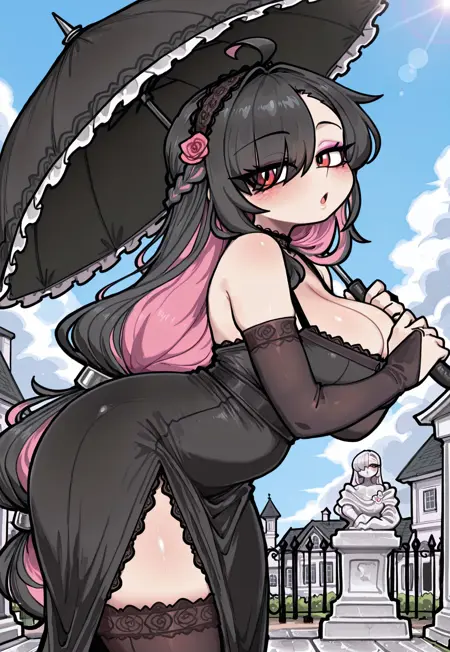 lvkv4,1girl,curvy,very long hair,red eyes,wavy hair,half up braid,asymmetrical bangs,hair over one eye,ahoge,black hair,pink inner hair,low-tied long hair,makeup,pink eyeshadow,brown lipgloss,blush,