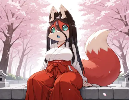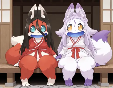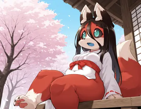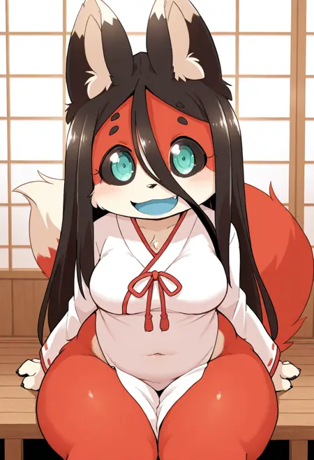 基础提示词:黑色眼白,青绿色眼睛,尖牙,长发,黑发,头发遮住眼睛,直发,红色毛发,奶油色毛发,多色毛发,蓝色嘴巴,狐狸耳朵,狐狸尾巴,动物爪子,毛发高光,宽臀,粗大腿,腹部,大乳房,狐妖,动物拟人,狐狸