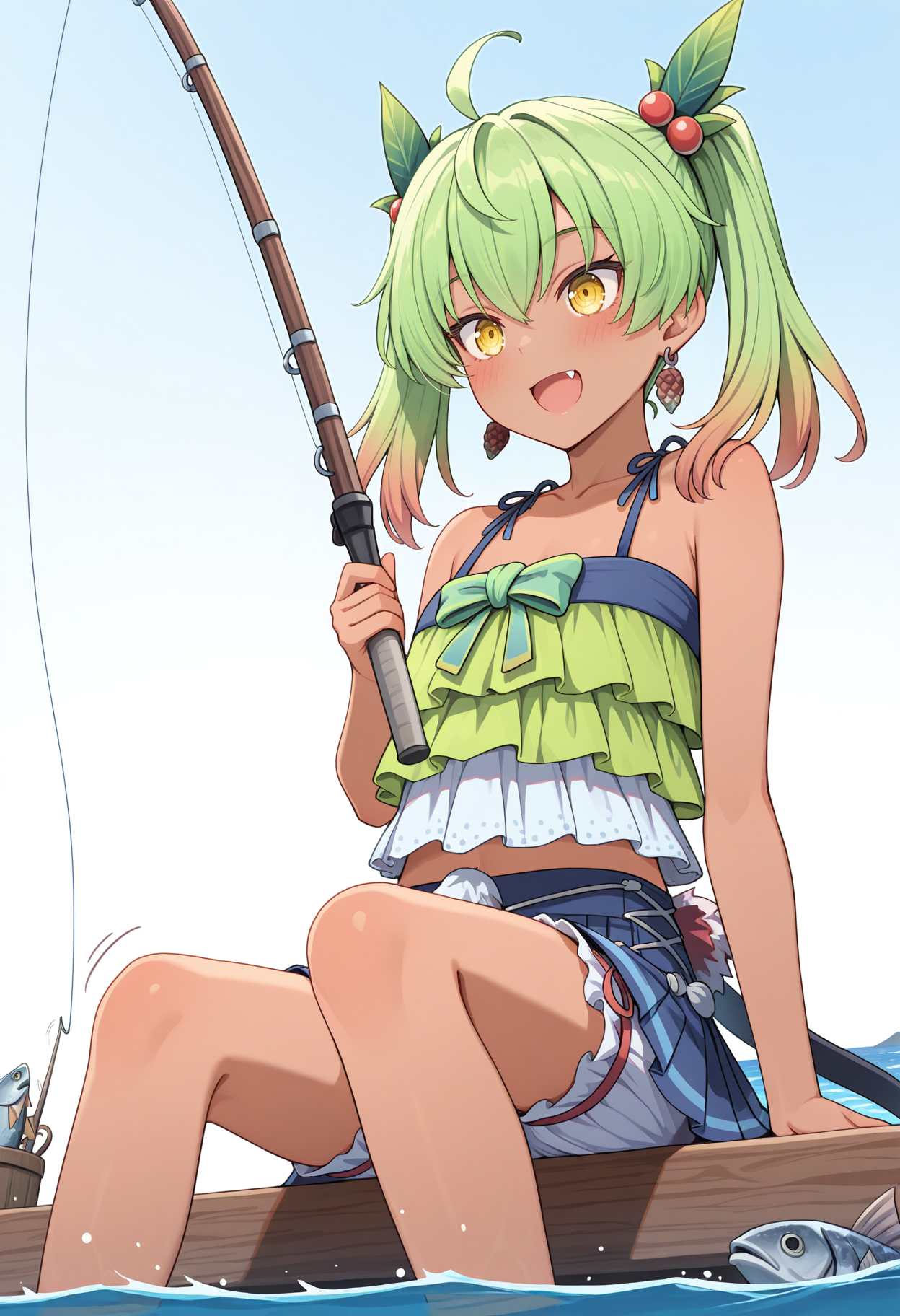 ys8rico, 녹색 머리, 그라데이션 머리, 트윈테일, 검은 피부 여자, 노랑색 눈, 잎 모양 머리 장식, 머리 끈, 아호게, 귀걸이, 평평한 가슴, 송곳니,