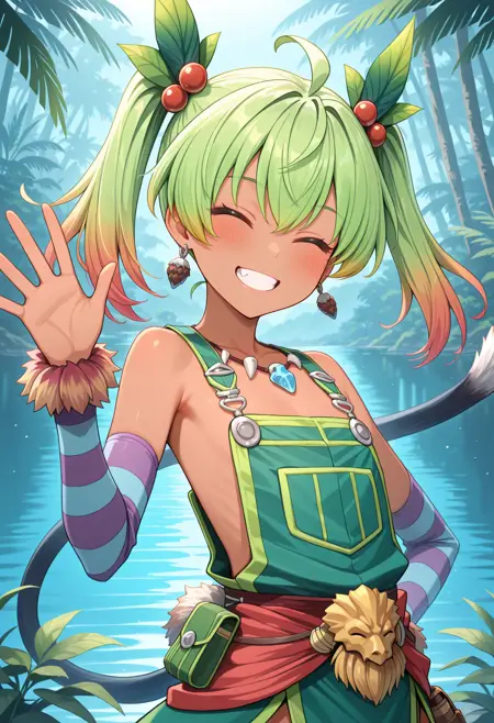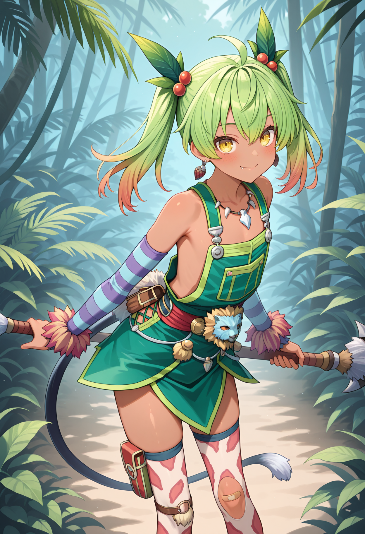 riys8def, 녹색 오버올, 오버올 스커트, 어깨 노출, 보석, 이빨 목걸이, 분리형 소매, 줄무늬 소매, 팔 보호대, 허리 주변 붉은 옷, 주머니, 꼬리, 무릎 붕대, 버클, 야생동물 무늬 허벅지 양말,