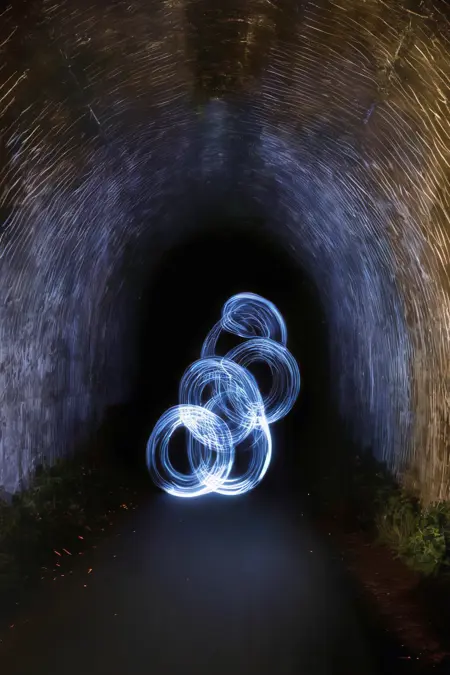 長時間露光はキンベルのスタイルの中心的な要素です。彼は光源の動きを長く露出して捉えることで、運動感とエネルギーを感じさせる画像を生み出します。この技法により、彼の写真には夢幻的で異次元的な質感が生まれます。