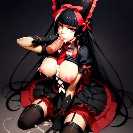 (Rory_Mercury, gothic fashion, lolita_fashion, gothic dress, gothic_lolita, gloves, black thighhighs, garter straps, black dress with red frills, long hair, black hair, red eyes, bow, ribbon, hair ribbon, makeup)
