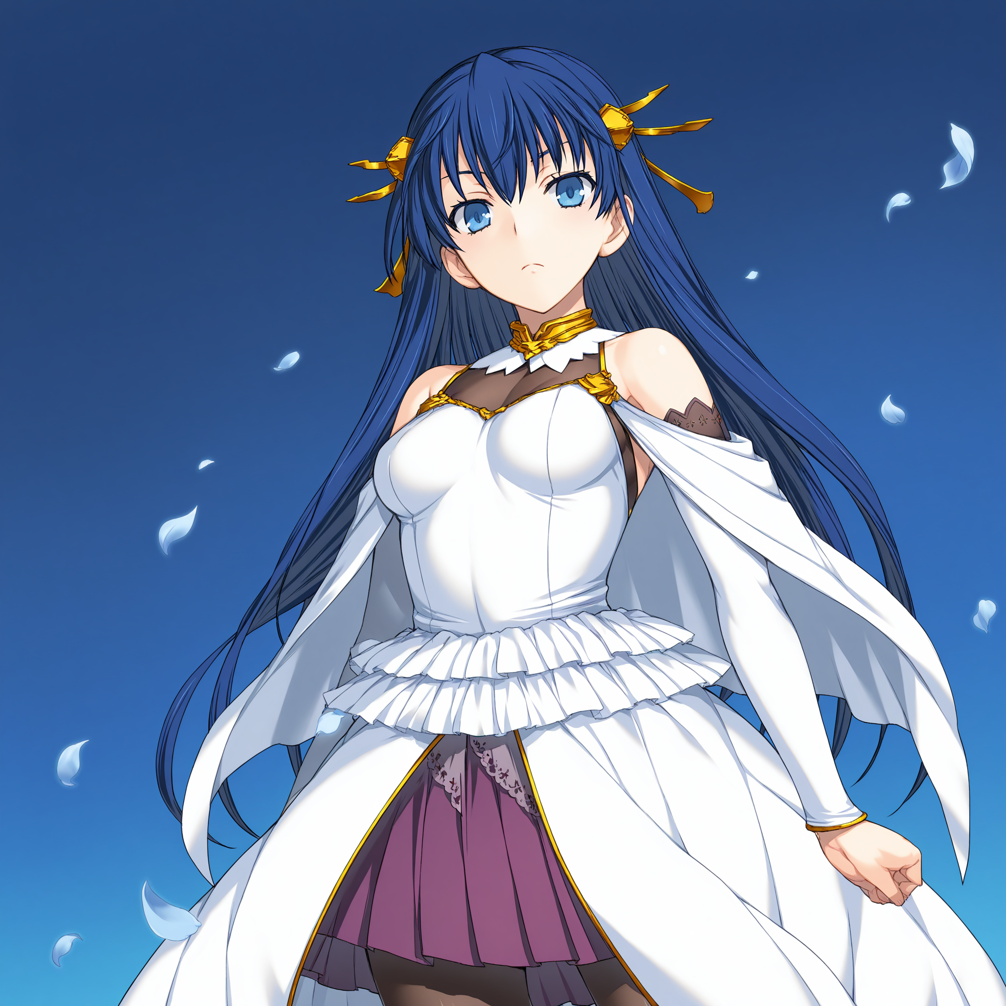 white dress,capelet,black pantyhose,bare shoulders,purple skirt, hair ornament,