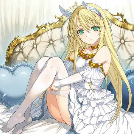 Sheila_White_Dress, white dress, frilled sleeves, feather hair ornament,