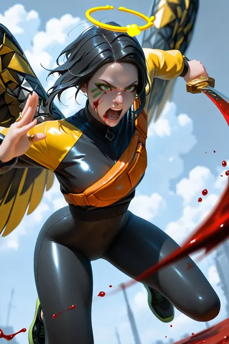 트리거: drk, 하로, 이톤 날개, 검은 머리, 단발, 녹색 눈, 얼굴 문신, 코 피어싱, 코 링, 재킷, 허리 가방, 골든 링, 요가 팬츠, 스니커즈