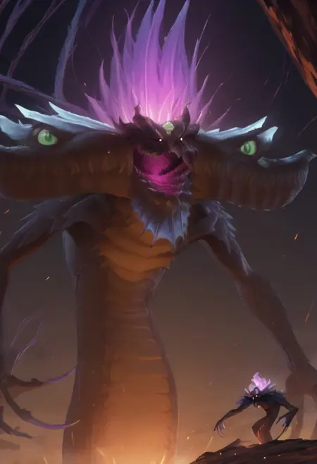 Dark Gaia, monster, black body, giant black horns, glowing purple eyes, purple mouth, claws