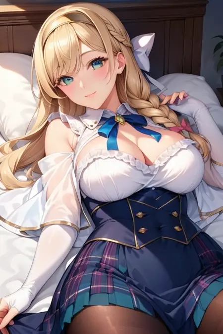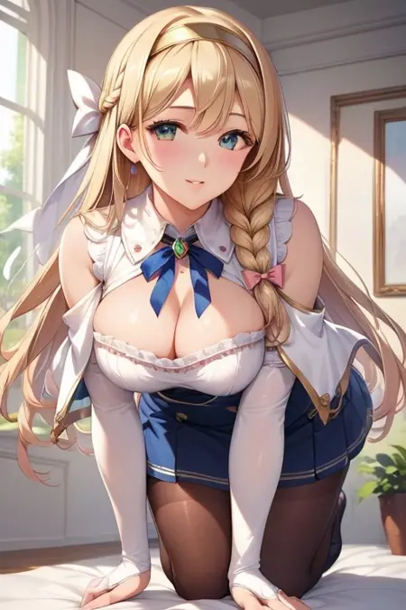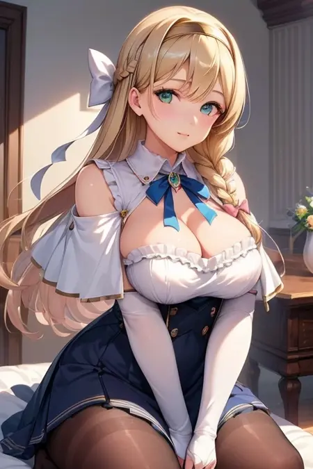 Trigger words: klaudia_a, long hair, side braid, hairband, white hair bow, white capelet, shoulder cutout, cleavage, blue neck ribbon, frilled shirt, elbow gloves, partially fingerless gloves, high-waist skirt, blue skirt, black pantyhose,