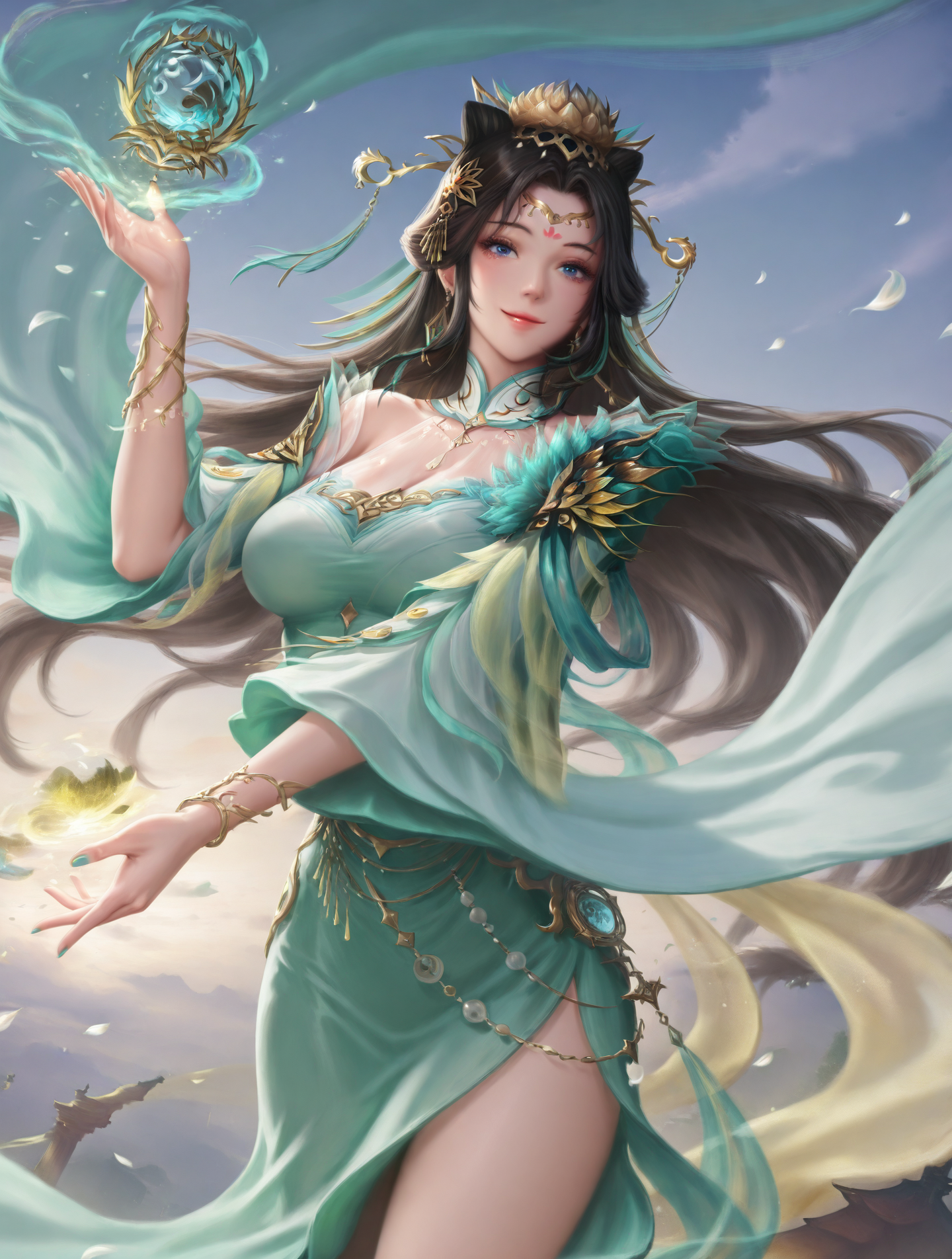 1girl,black hair,blue eyes,brown hair,closed mouth,dress,earrings,facial mark,forehead mark,green dress,hair ornament,jewelry,long hair,petals,sky,solo,