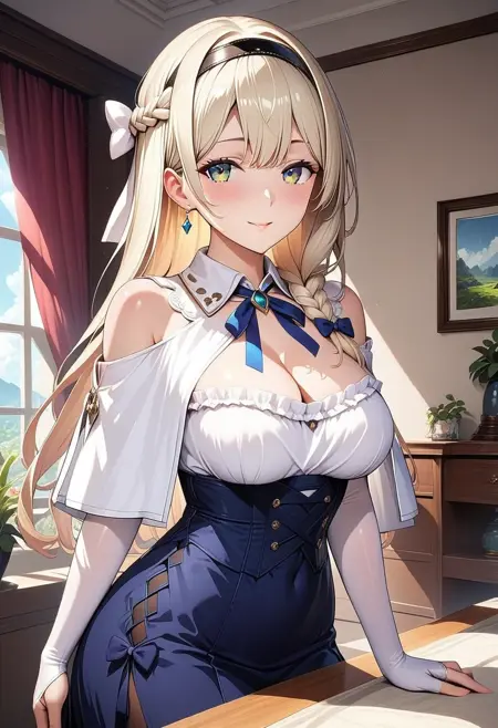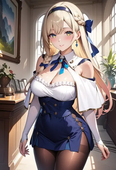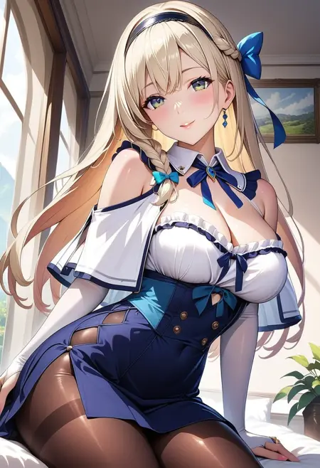 トリガーワード: klaudia_a_xl, 長い髪, 横編み, ヘアバンド, 白い髪のリボン, 白いカーディガン, 肩の切り替え, 胸元の開き, 青い首元のリボン, フリルシャツ, 肘まである手袋, 部分的に指先が開いた手袋, 高ウエストスカート, 青いスカート, 黒いパンティーストッキング,