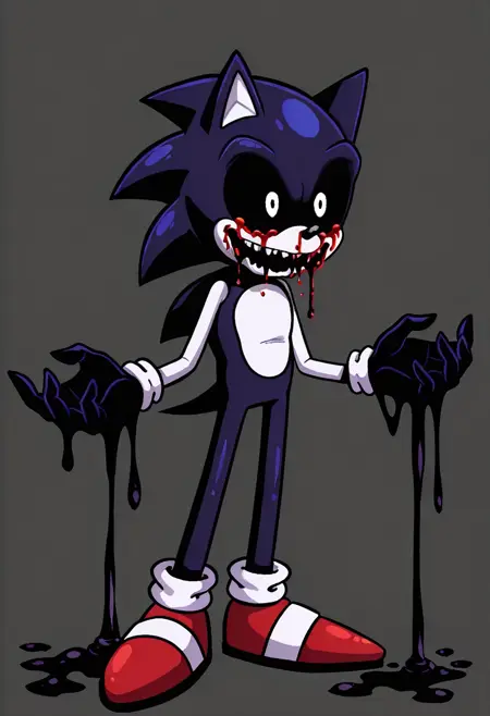 LeechEXE, 1boy, warped version of Sonic, darker blue fur, white eyes, black sclera, bloody tears, black substance for hands, red shoes, white skin, noseless, horror,